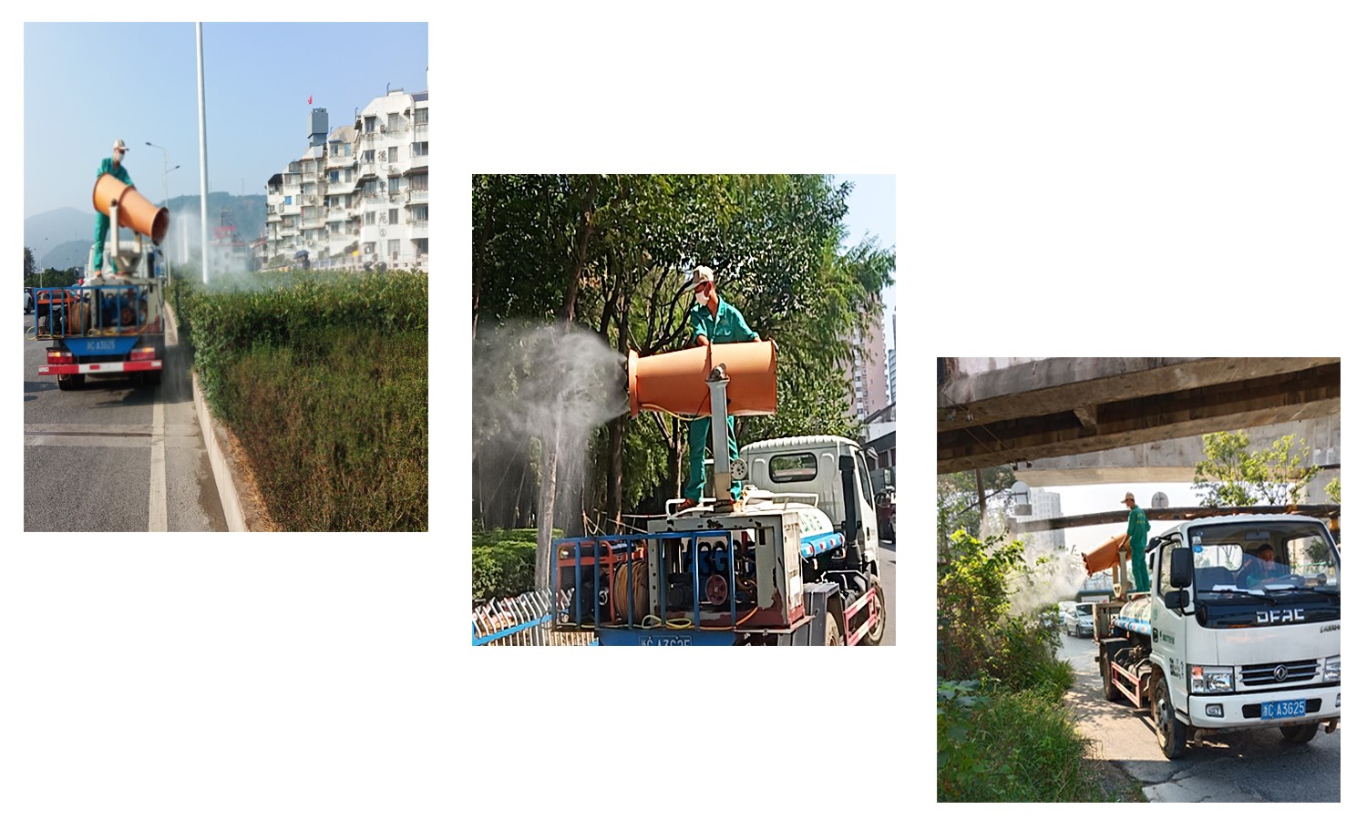 看,大型噴霧車正在對公路兩邊密集的綠化帶等蚊子聚集區(qū)域進行高強度的噴霧消殺,范圍大,強度大,藥液量足,持續(xù)噴藥時間長讓蚊子無處遁形。
