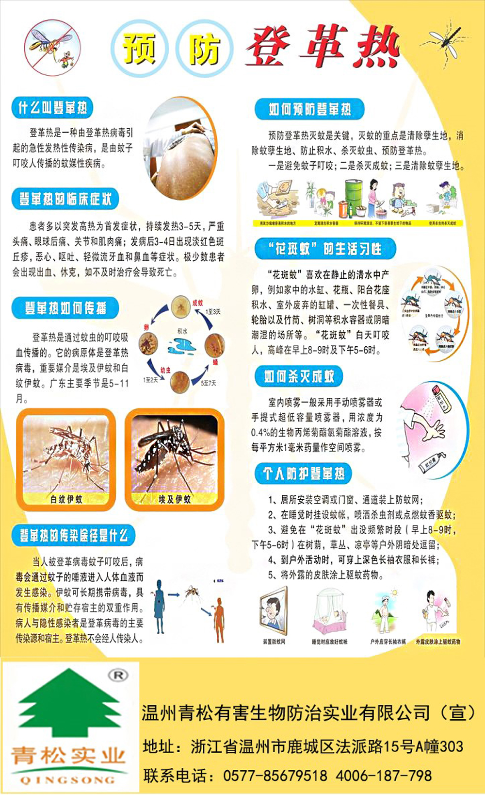 蚊蟲滋生傳播疾病,害居民身體健康。為進一步做好登革熱防控工作加強對登革熱疫情的防控工作,做好防蚊滅蚊和宣傳,防止疾病傳播,將登革熱扼殺在搖籃里,受鹿城區(qū)南郊街道的委托,溫州青松有害生物防治實業(yè)有限公司,持續(xù)一個多月開展登革熱消殺防制及防蚊滅蚊行動。接到委托后,青松實業(yè)上下高度重視,董事長朱雪松統(tǒng)籌安排,組織領(lǐng)導(dǎo)和技術(shù)骨干制定有針對性的消殺防制方案。準備高效消殺藥液和備齊各式專業(yè)消殺設(shè)備投入到這場預(yù)防蚊媒傳染的登革熱消殺防治的戰(zhàn)斗中。
