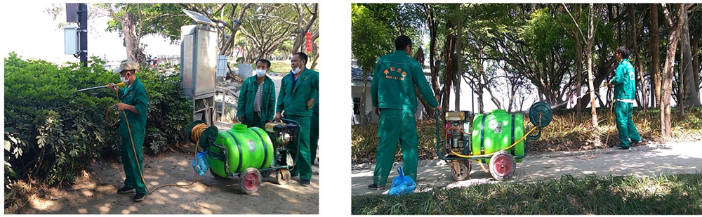 對大型噴霧車不方便進入的蚊子聚集的密集區(qū)域采用手推式動力噴霧機,機動能力強,載藥量大,噴射強度大,持續(xù)有效的消滅這些區(qū)域的蚊蟲。