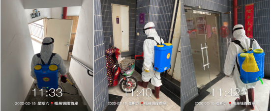▲青松的消毒人員對樓梯和居民出入口進行消毒