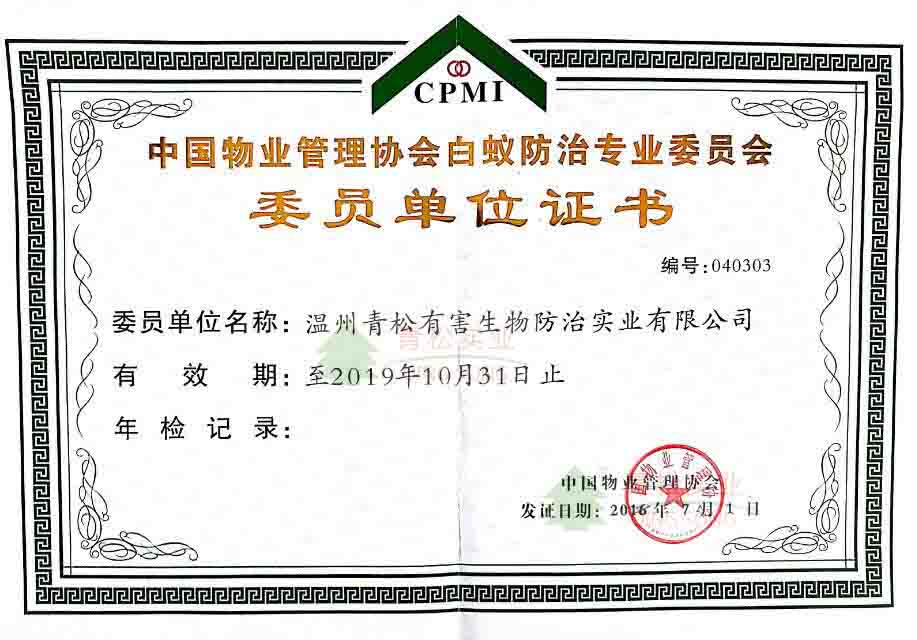 中國(guó)物業(yè)管理協(xié)會(huì)白蟻防治專業(yè)委員會(huì)委員單位證書(shū)